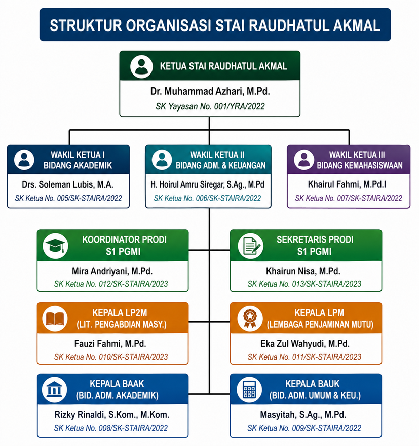 STAI Raudhatul Akmal memiliki struktur organisasi yang dirancang untuk memastikan pengelolaan akademik, administrasi, keuangan, mutu, penelitian, serta kemahasiswaan berjalan secara efektif, transparan, dan profesional.